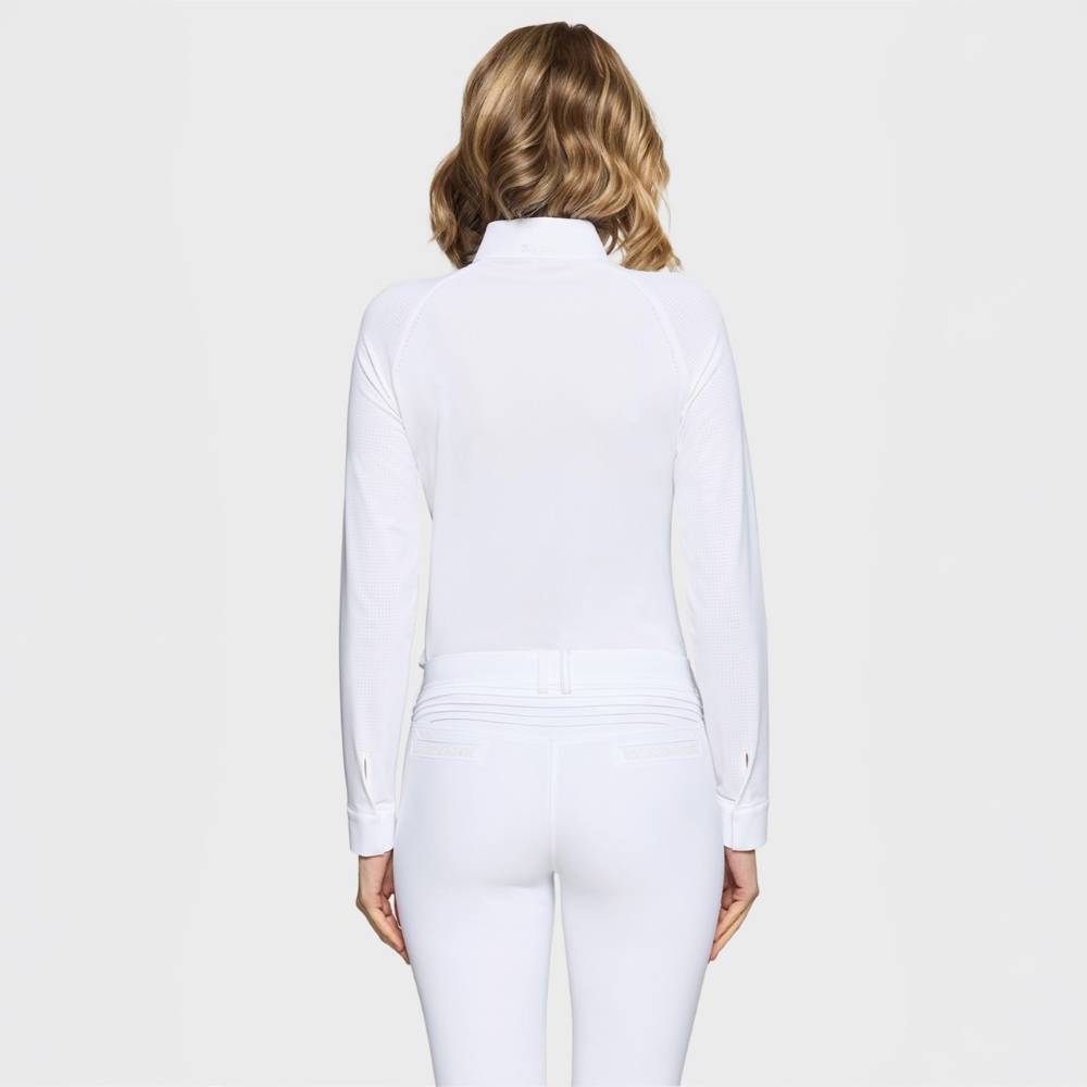 Le haut de compétition Adeline Boreal redéfinit l’élégance équestre avec une coupe cintrée et un col montant qui structurent la silhouette avec majesté. Ses manches longues, terminées par des poignets à boutons magnétiques, allient praticité moderne et raffinement traditionnel. Confectionné dans un tissu italien technique aux propriétés Quick Dry et anti-boulochage, il assure une tenue impeccable tout au long du concours. Son caractère unique réside dans son demi-zip orné de Swarovski Crystal Fabric et son jeu de cristaux boréaux, dont les reflets changent subtilement de couleur pour une allure blanche d’une pureté absolue.