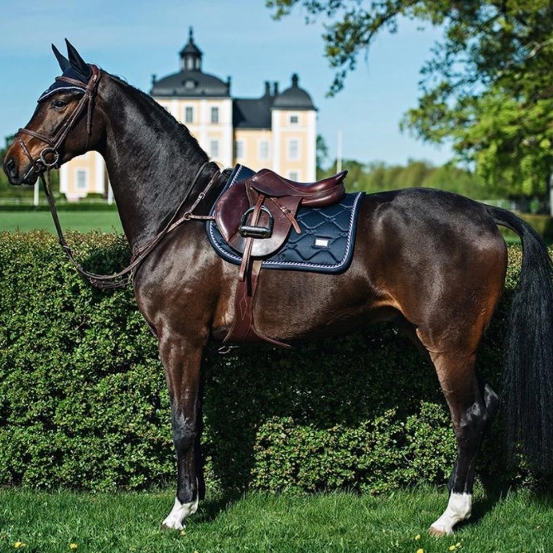 Notre tapis de selle de dressage de luxe, de couleur marine brillante avec des détails en argent, est parfait pour une journée d’entraînement. Matelassé avec l’élégant motif Equestrian Stockholm. Fabriqué dans une matière brillante et anti-salissure qui respire bien et garde votre cheval au sec pendant les séances de transpiration. Décorée d’un élégant badge argenté Equestrian Stockholm.